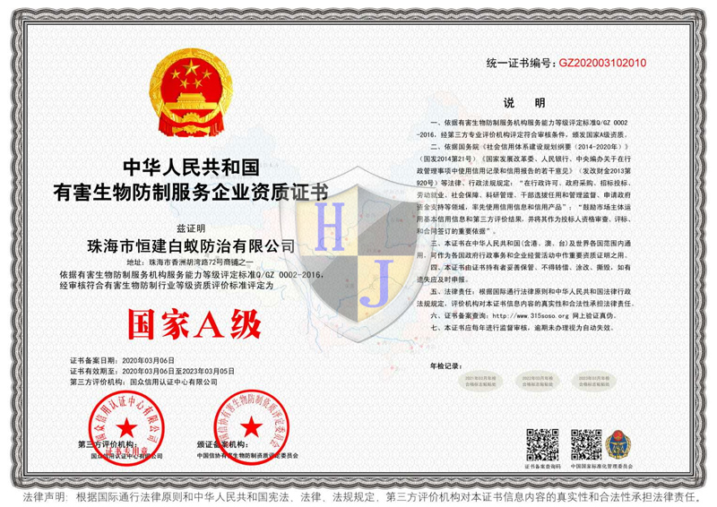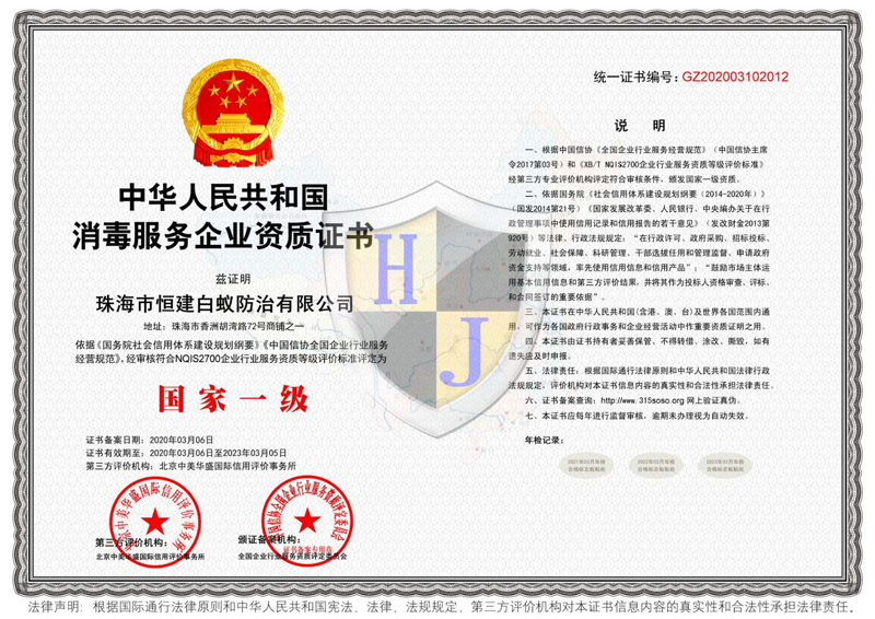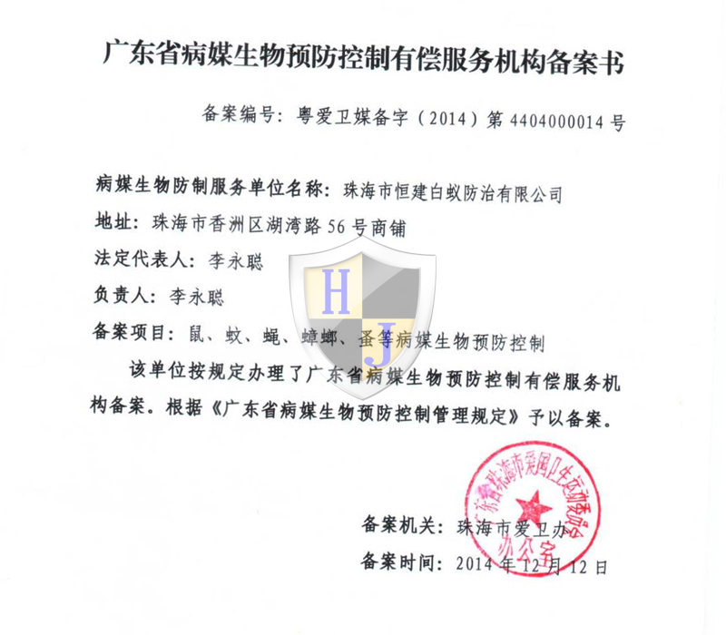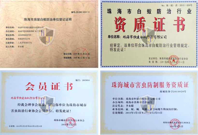 經多年專注誠信經營,公司獲得國家級有害生物防制A級資質證書、國家級消毒一級資質證書,通過廣東省病媒生物預防控制備案、市愛衛(wèi)辦頒發(fā)病媒生物備案證明、廣東省守信用重合同企業(yè)榮譽、城市蟲害行業(yè)等多項資質。